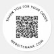 Customer thank you stickers feature a custom QR code surrounded by your website and thank you message in a minimal, modern all capital black sans serif font on a white background. Personalise the QR code with a link to a thank you video or your website and add your text in the sidebar. Use them on products or packaging to connect with your clients.