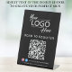 Modern black table top pedestal sign for your business with your QR code for customers to scan to make a payment, to see a list of your products, services and prices, to make appointments, to register, etc. Upload your logo and QR code and add your business name, phone number, street address or other information in simple white typography. Add your instagram and facebook user ids for customers to follow you on social media.