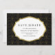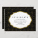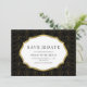 Elegant save the date card featuring a in black and gold pattern and sophisticated typography