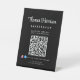 Modern black pedestal tabletop sign for your business featuring your name showcased in a stylish white signature script and business type in simple white lettering. Input your website address to create a QR code that customers and clients can scan for appointments, products, services, hours, etc. Add your instagram and facebook user ids for customers to follow you on social media. You can adjust the script size for longer or shorter names by editing in the design tool.