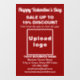 Happy Valentine’s Day! A lovely holiday to celebrate this February and to advertise also your business products and to promote your brand name. Customisable red colour window cling with Valentine Sale, your business name and other information. Window cling that you can use as marketing material to attract more customers. Customise it and display it to convince more customers to buy your products or clients to like your services. Contents are Happy Valentine’s Day greeting, sale texts with percent discount that you will offer, sale dates, your business name, logo, address, phone number, e-mail and website or your business social media page. Please check the appearance after uploading logo and typing texts. If the appearance is pleasing to you, you can place your order now. If you need to resize and move the logo and texts to fit on this window cling or on the size and shape that you will choose, please change in the design tool. You can also change the background colour, font colour and font style in the design tool. Happy Valentine’s Day! Wishing you more sales this holiday.