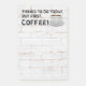 This is one of my favourite coffee quotes and I've put it on these 4"x6" note pads. THINGS TO DO TODAY. BUT FIRST, COFFEE! is set against a white brick wall. In the upper right hand corner is a steaming cup of coffee.