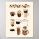 Delicious coffee dessert drinks (cappuccino, macchiato, espresso, etc) hand-painted in gouache and watercolors make up this fun vintage-style poster.