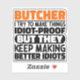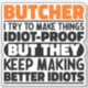 Funny Butcher Sayings "Butcher I Try To Make Things Idiot Proof But They Keep Making Better Idiots". Grab this Funny Butcher design as a funny gifts for an awesome mum, dad or friend.