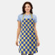 A checkerboard pattern with alternating yellow and blue squares. The repeating geometric design creates a vibrant, symmetrical visual effect.