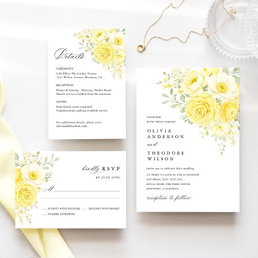 Matching items are available in the same butter yellow and ivory floral wedding suite, including wedding invitations, save the dates, details cards, welcome signs, seating charts, table numbers, menus, place cards, and more.
