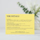 Butter Yellow QR Code Wedding Details Card, please personalise using the online personalisation template before ordering. Please change the URL shown in the template to show the URL for your own wedding website (for the QR code on the back) then please personalise the listing on the front (Reception, Accommodation, Transport or other details helpful to your guests) and the Reply-By date in the footnote on the front. The back of the card is a plain "butter yellow" colour apart from the QR code, however should you need to add anything extra onto the back of the design or make other further adjustments then you may click on the "Edit using Design Tool" button to "customise further"; this button is available by scrolling down in the online personalisation template. The front of the enclosure card features stylish grey text, while the back of the card features a QR code in black and white (so that it is easy for the QR code to be scanned by a guest with a modern phone).