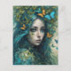 A woman with flowing blue hair is surrounded by butterflies and leaves, creating a mystical and ethereal atmosphere. Her serene expression and the vibrant colours convey a sense of harmony with nature.