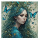 A woman with flowing turquoise hair is surrounded by vibrant blue butterflies, creating an ethereal and dreamlike scene. Her serene expression complements the natural beauty and movement of the leaves interwoven with her hair.
