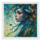 A woman with flowing, aqua-coloured hair is surrounded by numerous colourful butterflies, adding a sense of whimsy and magic to the scene. Her expression is serene yet captivating, harmonising with the vibrant butterflies fluttering around her.