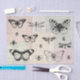This tissue paper is designed with butterflies, ladybugs, beetles, bees, and dragonflies. The background features multicolored ledgers for a vintage vibe.