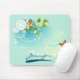 An abstract background with circles and swirly shapes. The colour is a soothing springtime green, turquoise and yellow in light pastel colours. A couple of orange and yellow butterflies hovering around some delicate flowering blossoms with green leaves and brown branches. Has a delighful, magical look. Mint green background. Personalise with a name.