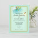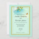 An elegant nature themed wedding invitation. An abstract background with circles and swirly shapes. The colour is a soothing summery green, turquoise and yellow in light pastel colours. A couple of orange and yellow butterflies hovering around some delicate flowering blossoms with green leaves and brown branches. Has a delighful, magical look.. A gold bordered transparent overlay in the centre displays all your wedding information. The background is mint green.