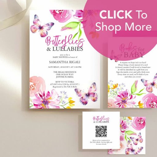 Discover the charm of our budget garden-themed baby shower invitations, adorned with the delicate beauty of watercolor butterflies and florals in soft hues of pink, peach, and orange. "Butterflies & Lullabies" graces each invite in stylish typography, ready for you to customise with your details through easy-to-use template fields. Choose from a variety of formats including printed flyers, cards, printable invites, or digital versions in our collection to perfectly match your planning needs. Explore an extensive collection of bespoke baby shower invitations and DIY templates at www.zazzle.com/dotellabelle, all featuring the distinctive watercolor artwork and designs crafted by Victoria Grigaliunas for Do Tell A Belle, making your invitation as unique and special as your upcoming celebration.