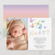 Colorful modern baby shower thank you cards featuring a plain white background that can be changed to any color, trendy pastel rainbow colored butterflies, a photo of the newborn baby, and a cute thank you message.
