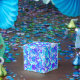 A flock of butterflies in shades of blue, turquoise, aqua, lavender and purple