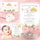 "Our Sweet Little Princess Is Turning One" photo "Birthday Party" landscape design featuring gradient uneditable script text for "Princess" with a faux gold glitter tiara crown, pink gradient butterflies and on the bottom faux gold glitter accented pink rose floral borders. Just add party details to complete the design.