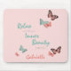 Personalise this pretty butterfly mouse pad with your name. This feminine design features butterflies and positive wording in script typography. The yogi wisdom reads "Relax and let your inner beauty emerge". It has a palette of pale coral pink, coral and teal green/blue. Please browse our store for matching and coordinating designs.