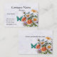 A feminine business card with a background of softly speckled colours of purples and blues on a white background. A bunch of daisies of white, yellow, orange and purple is on the right, with a butterfly getting ready to land.