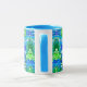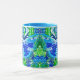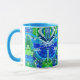 Coffee mug in a digital batik pattern of large butterflies on an ornate, arabesque medallion background, in shades of cobalt blue, turquoise and jade green