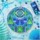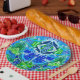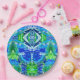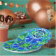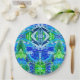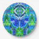Paper plates in a Large blue and turquoise butterfly on an ornate, arabesque medallion background, in cobalt blue, turquoise and jade green