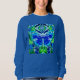 Sweatshirt in a large blue and turquoise butterfly on an ornate, arabesque medallion background, in cobalt blue, turquoise and jade green