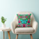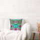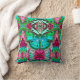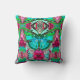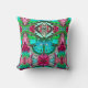 Pillow in a digital batik pattern of a large butterfly on an ornate, arabesque medallion background, in shades of turquoise and deep rose pink