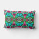 Lumbar Pillow in a digital batik pattern of large butterflies on an ornate, arabesque medallion background, in shades of turquoise and deep rose pink