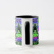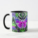 Coffee mug in a digital batik pattern of large butterflies on an ornate, arabesque medallion background, in shades of violet purple, blue and sage green