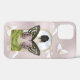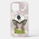 This imaginitive and truly unique dream-like design features a fantasy woman with her back turned gazing out at the dreamy cloud-filled sky. She has a pair of butterfly wings on her back as though she can fly. Smaller white butterflies are scattered over the design against a shimmering pearl-pink cloud filled sky. A text template is included to personalise this case with your monogram initials.