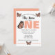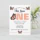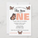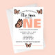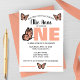 The large statement “ONE” in warm peach tones creates a bold focal point, while delicate butterfly illustrations add a whimsical, feminine touch. Clean, modern fonts paired with soft, fluttery details make this invitation both elegant and fun.