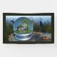 Inside a "snow globe" is a summer landscape with a cottage overshadowed by maple and cherry trees. The surrounding grassy field is filled with lilies and wildflowers in bright colours. Roses and ivy climb the wall of the little house. It's a late summer day, and a thousand bright orange and blue butterflies swirl around the globe.