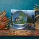 Inside a "snow globe" is a summer landscape with a cottage overshadowed by maple and cherry trees. The surrounding grassy field is filled with lilies and wildflowers in bright colours. Roses and ivy climb the wall of the little house. It's a late summer day, and a thousand bright orange and blue butterflies swirl around the globe.