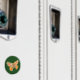 A deep green circular magnet with a pretty butterfly motif in pinks and oranges.