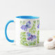 White mug with blue handle and rim, decorated with watercolour painting of butterflies
