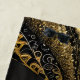Bright golden yellow butterfly on black background with stylish swirls ornate design.
