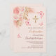 A peach background. Decorated with rose gold and pink florals, roses, pampas grass, butterflies and a golden cross. Personalise and add your name and details details.