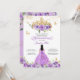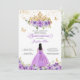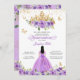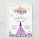 Quinceanera invitation in lilac and lavender shades of purple featuring gold butterflies and a beautiful tiara and a girl in a flowing ball gown. Visit shop for more variations in skin tone and colour combinations