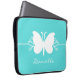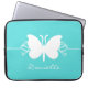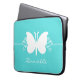 Sweet and simple Butterfly Swirls Laptop Sleeve in aqua featuring a lovely butterfly silhouette and swirl border. This lovely electronics bag may be customised with the personalised text of your choosing. This pretty butterfly sleeve is girly and stylish and perfect for protecting your computer! Click on the "Customise It" button to additional personalisation options.