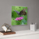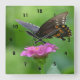 This wall clock features a dark coloured butterfly resting on a pink zinnia.