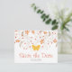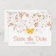 This elegant and playfully romantic save the date postcard design features an orange & yellow floral lined light brown branch with dark yellow butterfly. The bride & groom's names in a coordinating colour to match the flowers. The front states 'Save the Date' and the wedding date. The reverse side has all the important information for the recipient regarding the upcoming wedding. This would be nice for a late summer or autumn wedding or could be customised into an anniversary party invitation or bridal shower invitation.