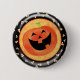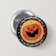 Happy Halloween button with jack-o-lantern and candy corn against a black and orange background.