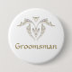 A button badge for each groomsman. Part of a complete wedding planner package for those with little time or knowledge of organising the wedding day, or just prefer a ready made solution, with most of the stationery, invitations, RSVPs, replies, thank you letters and cards, and worn apparel and garments needed, from announcement of the engagement through to the wedding ceremony and reception. In a rush and no time to plan? Pick and choose what you need from this matching collection of living happily ever after wedding stationery products, clothing and event gifts. The complete set is customisable and easy to change. Change the logos and graphics, the colours of the background, borders and fonts. Change the font style and size as well as colour. Personalise the products with the name of the bride, groom, the wedding party and all those who make the ceremony the happiest Happy Ever After wedding day ever.