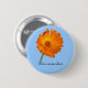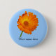 Name badge. Customise with your personal information. Orange calendula with green stem on blue background.