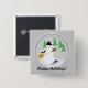 Snowman is shoveling the snow wearing his top hat. Pine trees are in the background. The 3d globe stands out against the grey background of the button. "Happy Holidays" is written beneath.