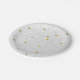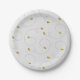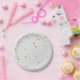 Buzzing bees leave a trail of looping lines flying over a simple white paper plate for a kids birthday party, baby shower or any occasion.