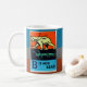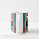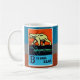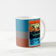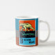 Charles Buckles Falls - B is for Bear, woodcut, 1923. A page from a 1923 ABCs book, this colourful illustration boldly depicts a bear confidently striding on all fours past a dead log, with an orange sky and blue highlights. Fun Fact: The black square in the corner is the artist's signature. Background colours of the mug extend the colour theme of the illustration in muted complementary colours, but can be changed in "Edit."