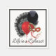 Package of 50 white paper cocktail napkins with an image of a black feathered fan, red and black balloons, and a red mask. The optional text “Life is a cabaret!” is in black French script. Black border. See matching cloth napkin, kitchen towel, cloth placemat, paper placemat and coasters. See the entire Cancan Napkin collection in the FOOD/BEV | Linens section.