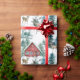 Winter scene with a cabin in woods with evergreen trees and Christmas deer, modern holiday pattern.
