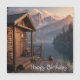 This birthday card features a rustic cabin with view of mountains and lake.